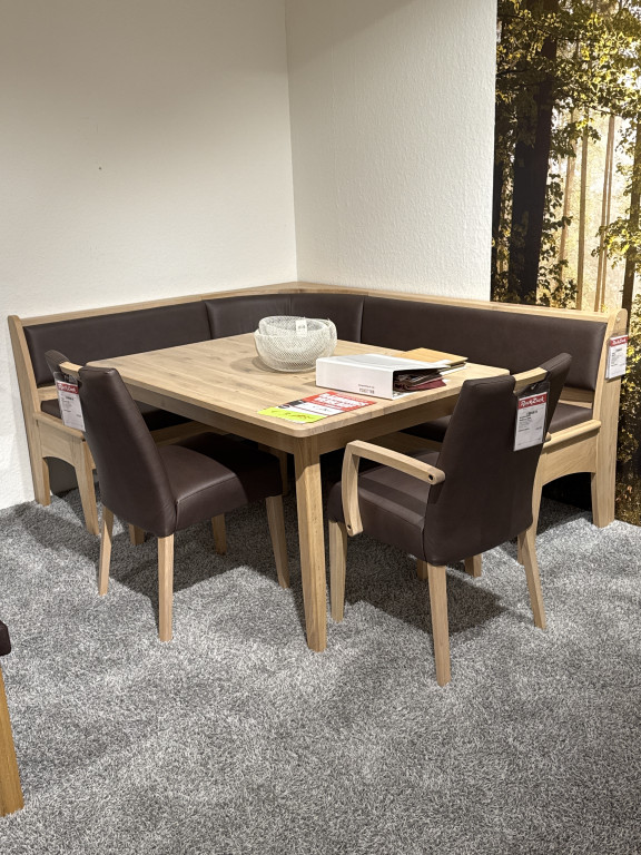 Wildeiche bianco massiv lackiert Sitz Tonnentaschenfederkern Best. aus. Eckbank 158 x 198cm mit Truhe Tisch 90x130 cm 1x Stuhl 1x Armlehnstuhl