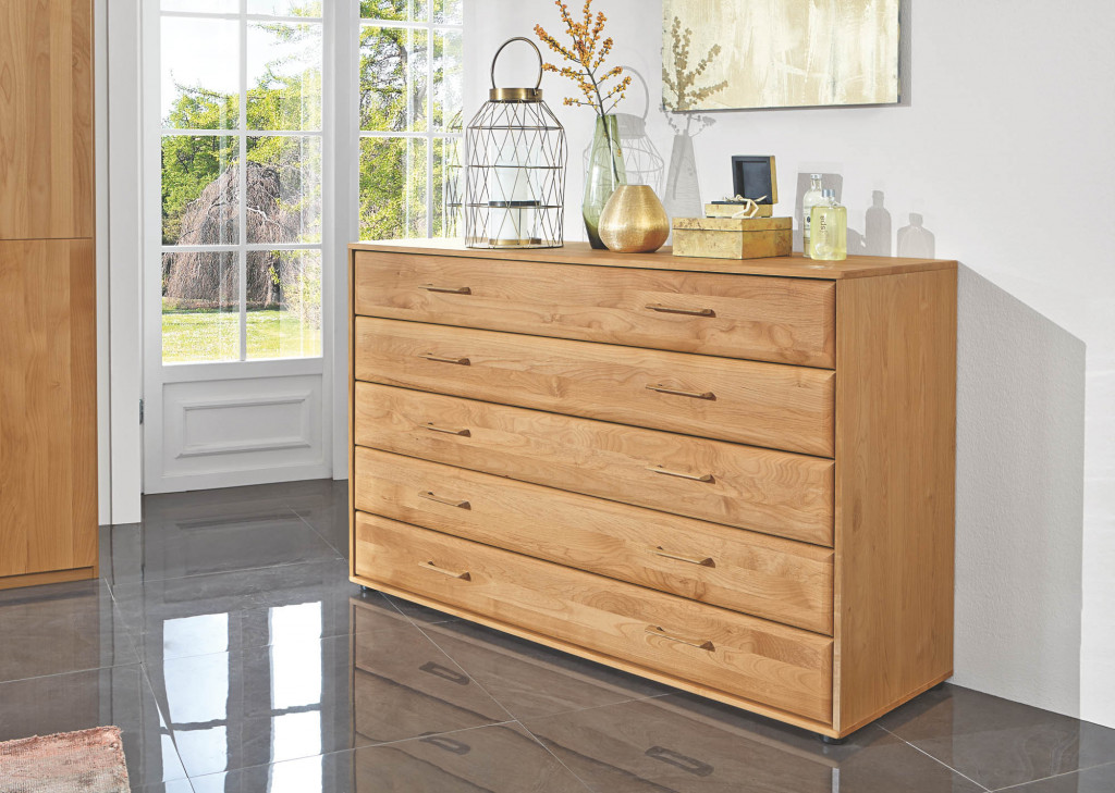 Bei diesem Schlafraum-Programm  treffen die traditionellen Elemente des Holzes auf edle Akzentuierungen. Lassen Sie sich inspirieren - Erle teilmassiv oder Eiche teilmassiv? Beide Charakteristika passen vortrefflich zu der Absetzfarbe Magnolie, welche wir in die äußerliche Gestaltung integriert haben. Hier bleibt kein Wunsch offen; ob Dreh-, Dreh-Gleittüren-Panorama-Funktions- oder Schwebtürenschränke - wir halten für jeden Geschmack etwas bereit! Die Fronten haben nahezu unzählige Gestaltungsmöglichkeiten aus Holz-, Spiegel- und Glastürenkombinationen. Zusätzlich gibt es Eckschränke, vollausgebaut oder begehbar, sowie Abschlussschränke. Als optisches Highlight können Sie Ihren Schrank mit einer Kranzleiste oder einem Passepartout-Rahmen, beides wahlweise mit oder ohne Beleuchtung, aufwerten. Die Betten stehen als Einzel- oder Doppelbetten in den Breiten 90 cm, 100 cm, 180 cm und 200 cm zur Verfügung. Darüber hinaus gibt es vier verschiedene Bettlängen. Alle Betten werden mit der komfortablen Bettseitenhöhe von 53 cm geliefert, kompatibel mit unserem Continental-Adapter-Set zur Erhöhung der Einlegetiefe der Matratze.
